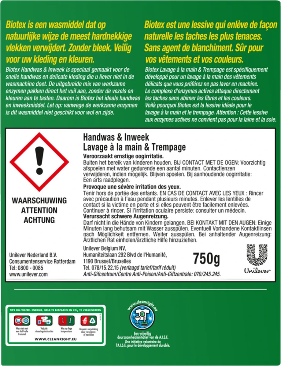 Biotex Handwas & Inweek is speciaal gemaatk voor de snelle handwas en delicate kleding die u liever niet in de machine doet. Met het biologisch enzymcomplex wordt het vuil aangepakt zonder de kleuren en stoffen aan te tasten.