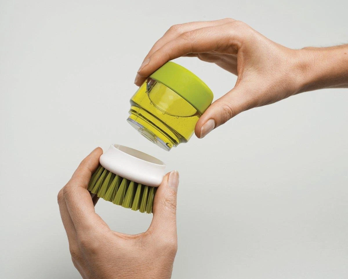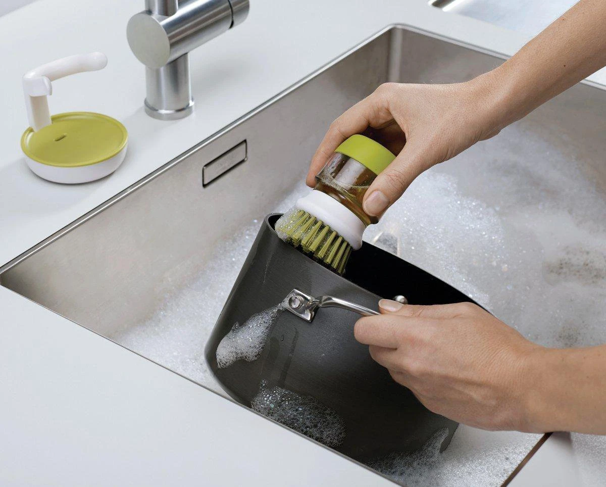 Deze innovatieve Palm Scrub afwasborstel van Joseph Joseph is ideaal voor het reinigen van pannen en servies. De afwasborstel is niet zo maar een afwasborstel, want deze is bevestigd op een handige zeepdispenser die u kunt vullen met afwasmiddel. Met 1 druk op de knop komt het afwasmiddel uit de dispenser via de afwasborstel, waardoor u servies en pannen eenvoudig kunt reinigen. Het afwassen van uw servies in een sopje is dus verleden tijd! Dit werkt niet alleen prettig, maar is ook hygiënisch. U hoeft servies en pannen nu nooit meer te reinigen in water dat al vervuild is. De afwasborstel heeft anti-kras borstelharen, waardoor u deze ook prima kunt gebruiken in pannen met een anti-aanbaklaag. De afwasborstel wordt bovendien geleverd met een handige houder. De houder vangt overtollig water en zeep, afkomstig uit de afwasborstel, eenvoudig op in het reservoir. U kunt de houder eenvoudig uit elkaar halen om het overtollige water en zeep weg te gooien. Daarna kunt u de houder eenvoudig reinigen in de vaatwasmachine. Hierdoor kunt u hygiënisch werken.